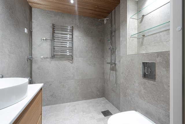 - WC-istuin, suihku, pesukoneliitäntä, pesuallas, allaskaappi, ja bidee-suihku