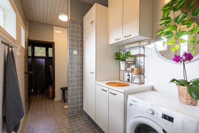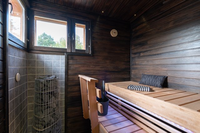 Kodinhoitohuoneen jatkona sijaitsevat kylpytilat, jossa ensimmäisenä on suihku kaakeliseinämän takana. Lasioven kautta on kulku saunaan, jossa on nätit pikkuikkunat kahteen suuntaan ja pilarikiuas. Tummanruskeiksi käsitellyt seinät ja katto luovat saunaan mukavaa tunnelmaa.