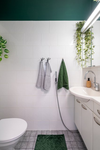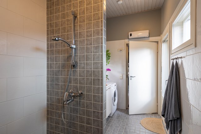 - Lattia ja seinät laattaa. Suihku, kaappi, tilavaraus pesukoneelle, varaus toiselle wc-istuimelle, lattialämmitys.