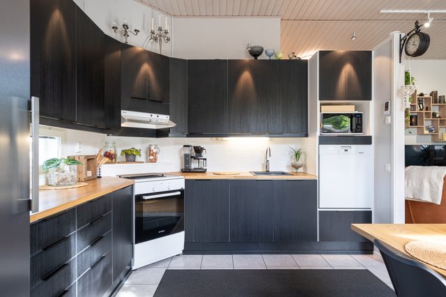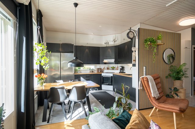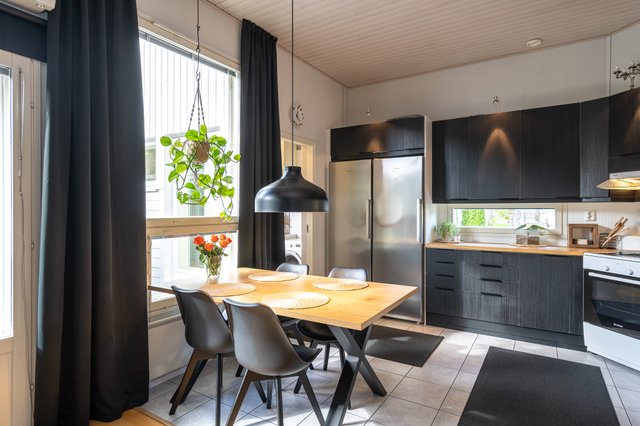 - Lattia laattaa, seinät maalattu. Keittiön kaapistot mustat, työtasot puuta, välitilassa valkoinen laatta. Jääkaappi (2023), pakastin (2023), astianpesukone (2016), induktioliesi (2018), liesituuletin. Tilassa lattialämmitys. Kaapistojen ovet vaihdettu sekä hana uusittu 2024, työtasot sekä pesuallas 2025.