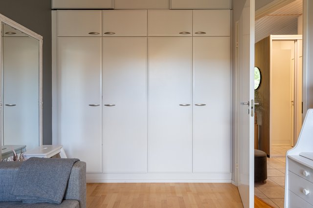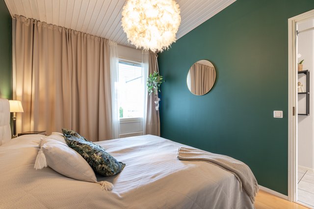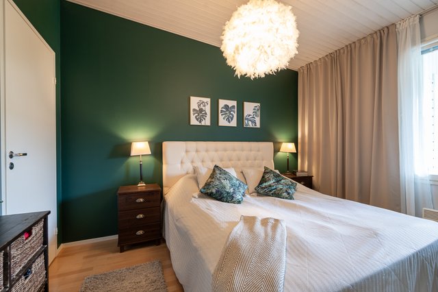 Asunnon makuuhuoneet sijaitsevat ensimmäisinä eteisen molemmin puolin. Oikeanpuoleisen, näkymiltään etupihalle päin olevan huoneen yhteydessä on erillinen vaatehuone, ja vasemmanpuoleisessa huoneessa on reilusti kiinteitä kaapistoja ja ikkuna etupihalle. Molempien makuuhuoneiden pimennysverhot kuuluvat kauppahintaan.