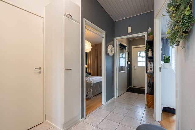 Sisääntulo asuntoon tapahtuu katetun ja laatoitetun etukuistin kautta, jonka yhteydessä sijaitsee huoneistokohtainen eristetty ulkovarasto. Asuntoon saavutaan laatoitettuun tuulikaappiin, jossa on tilaa ulkovaatteille ja -kengille. Tuulikaapin kenkäkaappi kuuluu kauppahintaan. Lisää säilytystilaa löytyy heti välioven takaa laatoitetun eteisaulan liukuovikaapistosta ja pystykaapista. Eteisaulasta on kulku erilliseen wc:hen, jossa on lattialämmitys, wc-istuin, iso allas- ja peilikaappi sekä seinähyllyt.