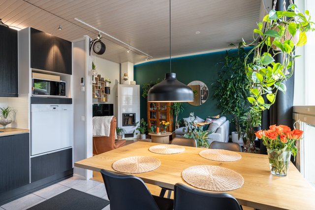 Tyylikkäässä ja avarassa keittiössä on muun muassa käytännöllinen lattialämmityksellä varustettu laattalattia ja puiset, vuonna 2025 vaihdetut työtasot. Myös pesuallas on vaihdettu vuonna 2025, kaapistojen ovet vuonna 2024 ja kodinkoneista jääkaappi ja pakastin vuonna 2023. Takapihan upealle terassialueelle päin olevan ikkunan eteen mahtuu neljän hengen pöytäryhmä.