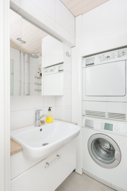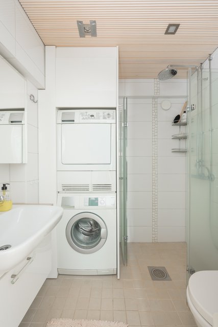- WC-istuin, suihku, suihkuseinä, pesukone, pesuallas, peilikaappi, lattialämmitys, allaskaappi, ja bidee-suihku valmius