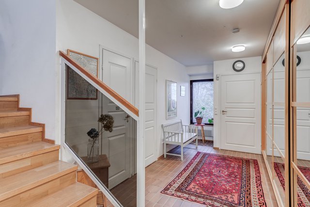 Käytössäsi on runsaasti tilaa: viisi huonetta, keittiö, ruokailutila, takkahuone sekä oma tyylikäs uima-allasosasto ja sauna. Tunnelmallinen takkahuone toimii tällä hetkellä studiona joka on helppo palauttaa takkahuoneeksi tai vaikka toiseksi olohuoneeksi. Kolme erillistä wc:tä ja kaksi kylpyhuonetta tuovat arkeen mukavuutta. Lisäksi löytyy kolme vaatehuonetta ja kodinhoitohuone. Vehreä ja suojaisa oma takapiha kallioseinämineen tarjoaa paikan rentoutumiseen ja yhdessäoloon. Parvekkeella voit nauttia aamuauringosta.