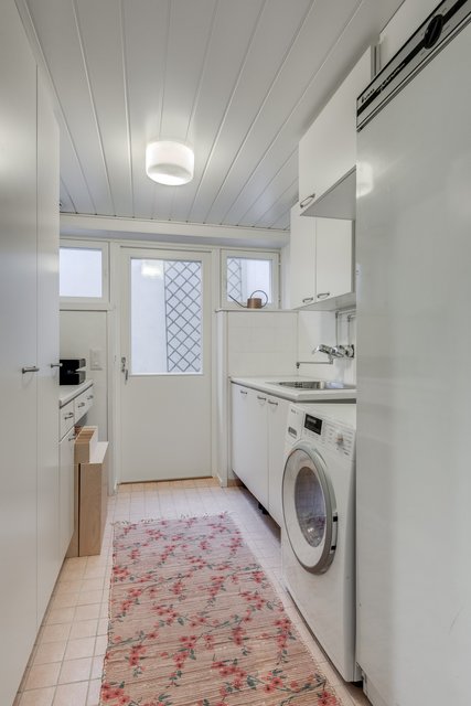 - Pesukoneliitäntä, pesuallas, pöytätaso, tila pesutornille, ja kuivauskaappi