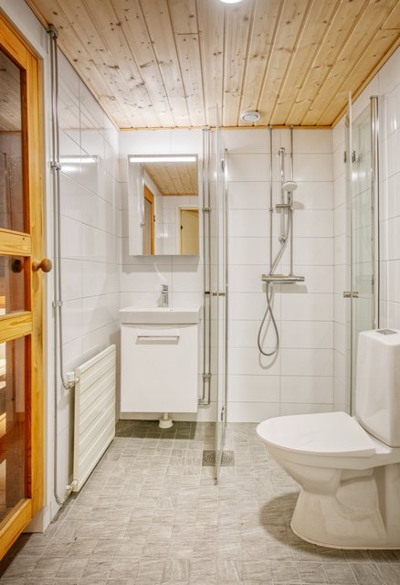- WC-istuin, suihku, suihkuseinä, peilikaappi, pesukoneliitäntä, allaskaappi, ja bidee-suihku