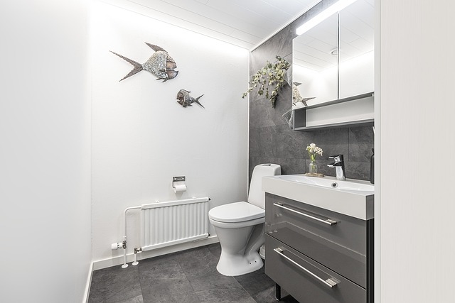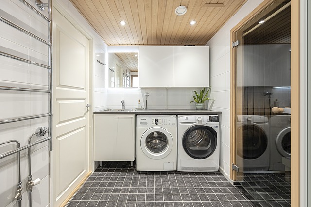 - Suihku, suihkuseinä, peili, allas, allaskaappi, seinäkaapit, taso, pesukoneliitäntä ja pyyhekuivain.