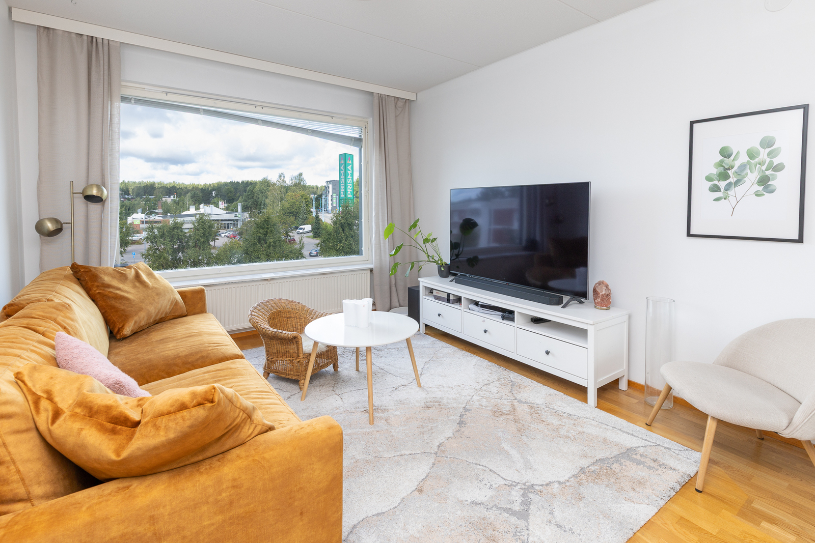 Valoisa ja tilava 69 m²:n kolmio hissitalon ylimmässä (4.) kerroksessa. Asunnossa on kolme huonetta, erillinen keittiö, kylpyhuone sekä oma sauna. Olohuoneen ikkunoista avautuvat upeat näkymät yli Nummelan, ja tilava etelään suuntautuva lasitettu parveke tarjoaa viihtyisän lisätilan keväästä syksyyn.