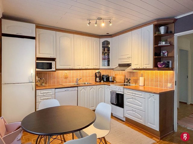 - Keittiössä on hyvin laskutilaa. Olohuoneseen ja aulaan avautuvassa keittiössä on helppo kulkea. Olohuoneen ja keittiön välissä on liukuovi, jolla saat tehtyä tilasta erillisemmän.