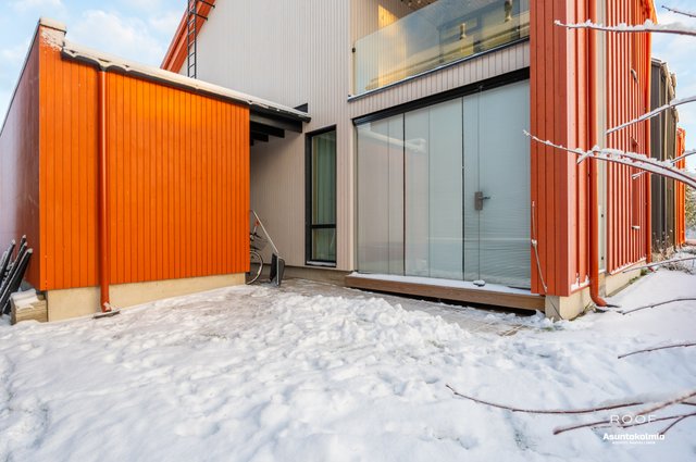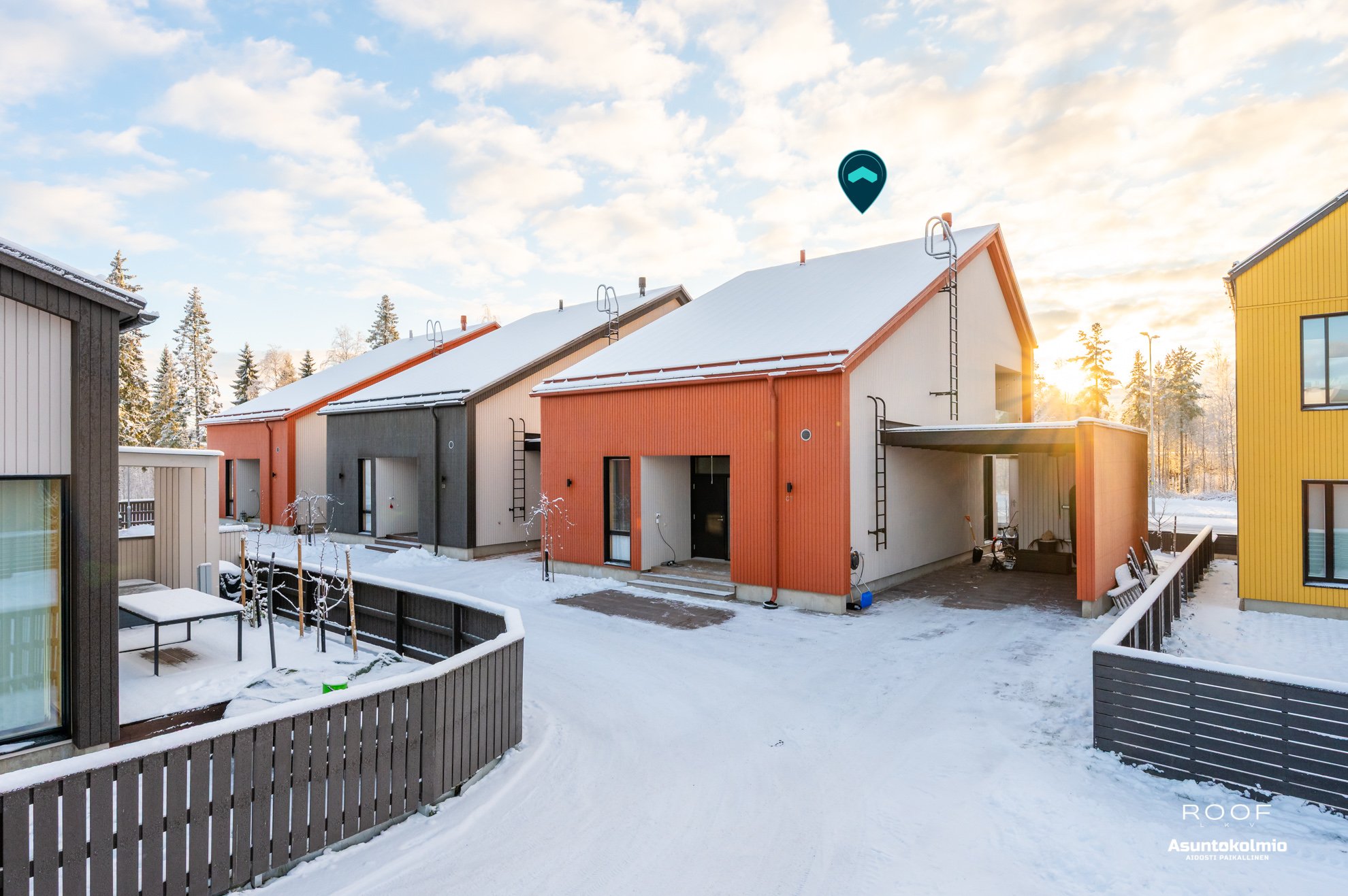 Suuret kiinteät ikkunat puunvärisine karmeineen, lähes 5,5 m korkea sisäkatto olohuoneessa ja ylipäätään tilan tuntu joka paikassa tekevät tästä jotain muuta kuin tavallisen erillistalon. Pohjaratkaisultaan asunto on erinomainen: yläkertaan on sijoitettu vain yksi suuri makuuhuone (15,5 m²) sekä reilun kokoinen 7 m² vaatehuone, ja kaikki muut tilat löytyvät alakerrasta. Koko asunto on sisustettu laadukkailla materiaaleilla ja kalusteilla. Keittiöön sopii tarvittaessa suurempikin ruokapöytä, ja käytännöllinen aamiaiskaappi kruunaa kauniin tilan. Ruokailutilasta on käynti toimivan malliselle lasitetulle terassille, jonka jatkeena on kompaktin kokoinen piha-alue, johon sopii kuitenkin tarvittaessa vaikka trampoliini.