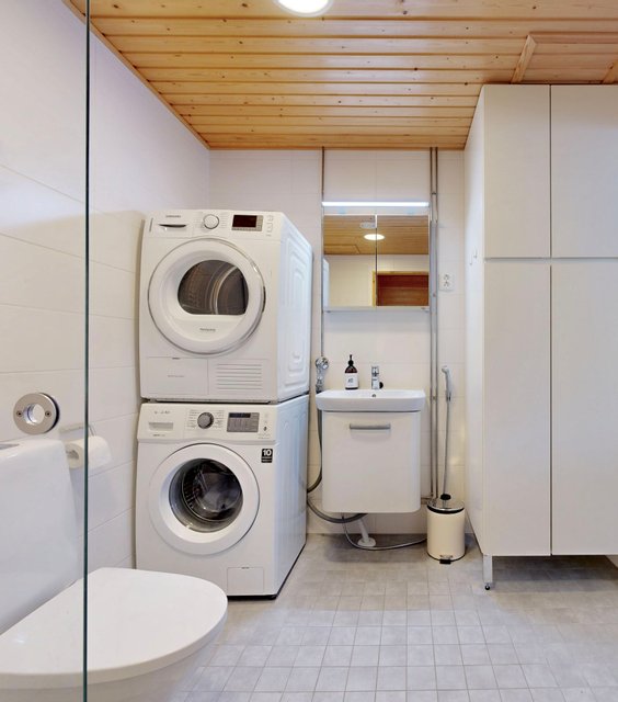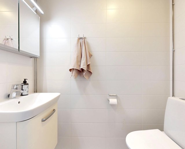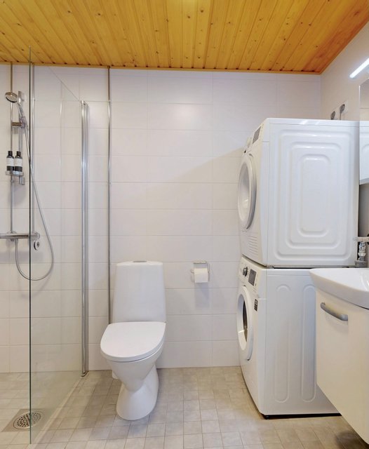 - VARUSTUS: Suihku, Suihkuseinä, WC-istuin, Pesukoneliitäntä, Allaskaappi, Allas, Hana, Peilikaappi, Lattialämmitys. SEINÄ: Laatta. LATTIA: Kaakeli.