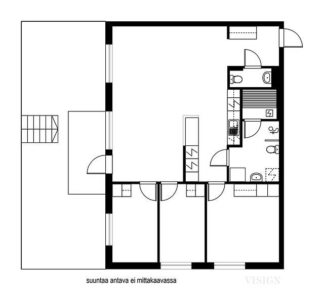 - Suihkuseinä, allaskaappi, pesukoneliitäntä, lattialämmitys, peilikaappi, wc-istuin, ja suihku