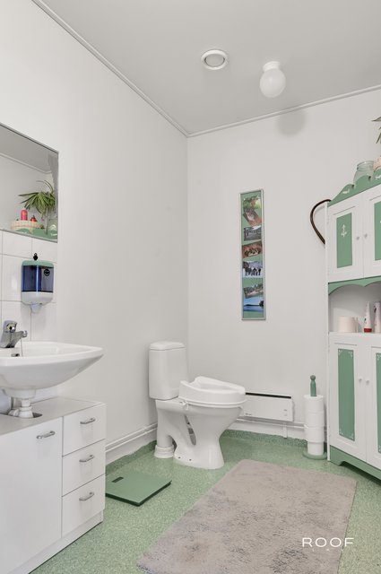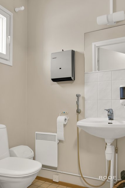 - WC-istuin, suihku, suihkuseinä, pesukoneliitäntä, lattialämmitys, ja peili
