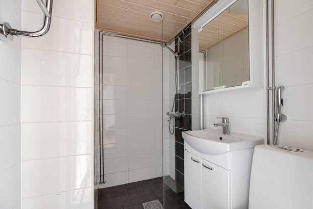 - WC-istuin, suihku, suihkuseinä, peilikaappi, lattialämmitys, pesuallas, allaskaappi, ja bidee-suihku