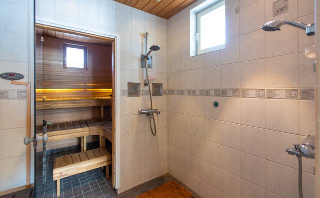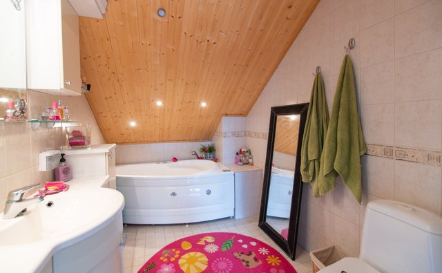- alakerrassa 2 suihkua, yläkerran kylpyhuoneessa poreamme, suihku, wc istuin, peilikaappi, lattialämpö