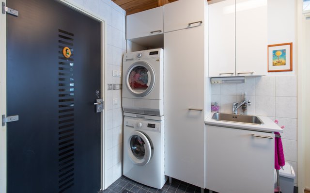 - Pesukoneliitäntä, lattialämmitys, lattiakaivo, silityspöytä/taso, kurapiste, pöytätaso, ja tila pesutornille