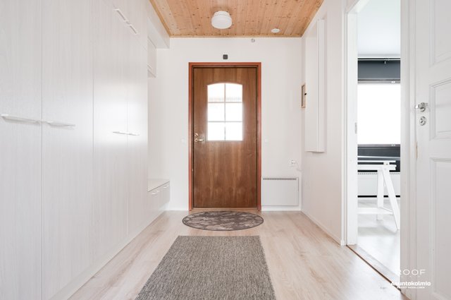 - Takkahuoneesta kulku suoraan ulos. Lattiat: laminaatti. Seinät: Maalattu. Lämmin varasto autotallin perällä. Lattia: Laminaatti. Seinät maalattu. Eteisen lattia: Laminaatti. Seinät; Tapetoitu Kuisti: Lattia laattaa. Seinät maalattu.