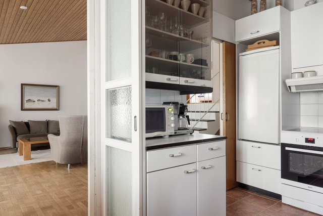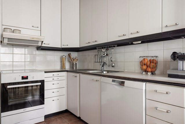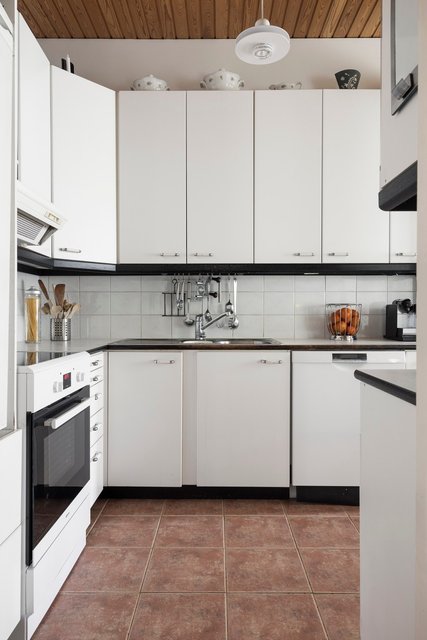 - Jääkaappi, keraaminen liesi, liesituuletin (katolle putki), astianpesukone. Lattia laattaa.