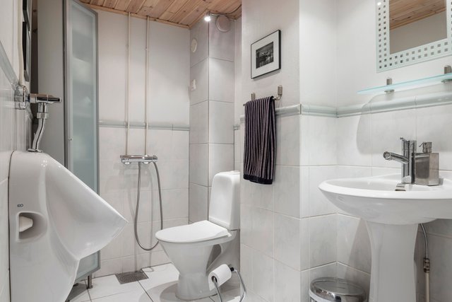 - Wc-istuin, pisoaari, jalallinen pesuallas, hana, peili. Lattiat laattaa, seinien alaosa laattaa, yläosassa maalattu lasikuitutapetti.
