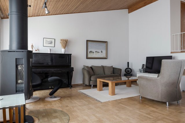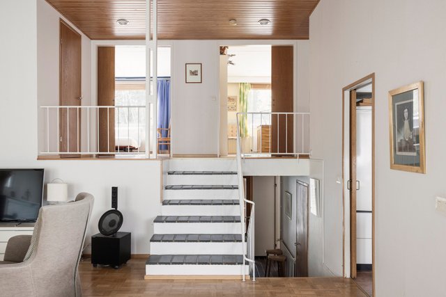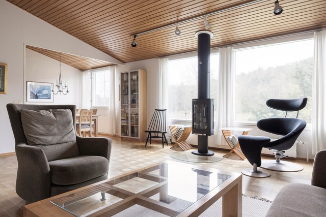 - Korkea ja tilava, avara ja valoisa olohuone! Olohuoneeseen asennettu takka. Valaisinkisko. Lattia tammiparkettia, katto paneloitu. Upeat näkymät takapihalle ja puistoon!
