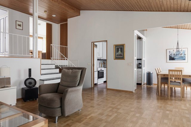 Parhaalla sijainnilla puiston reunalla jopa neljän makuuhuoneen päätyhuoneisto. Asunnon tilat sijoittuvat neljään tasoon. Alakerrassa on sauna, pesuhuone, poreallas-/SPA-huone, makuuhuone ja kodinhoito-/varastotila. Sisääntulokerroksessa on eteisaula, makuu-/työhuone ja wc. Tästä kerroksesta on myös kulku lämpimään autotalliin. Seuraavassa kerroksessa on olohuone ja keittiö upeine puisto- ja metsänäkymineen. Ylimmässä kerroksessa on 2 tilavaa makuuhuonetta ja kylpyhuone/wc sekä vaatehuone. Sauna, pesuhuone, poreallashuone, wc ja yläkerran kph/wc on remontoitu taloyhtiön putkiremontin yhteydessä 2003.