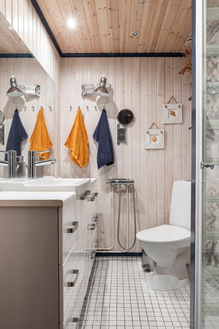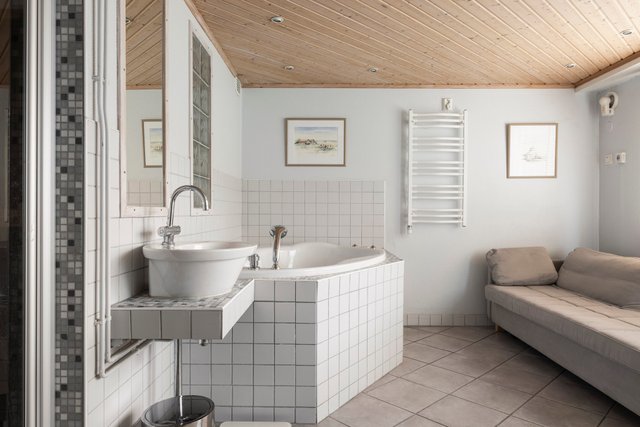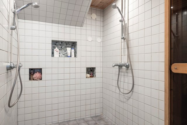 - Alakerrassa saunan yhteydessä pesuhuone, jossa kaksi suihkua. Lattia laattaa, seinät kaakeloitu, vesieristys ja lattialämmitys. Puku-/vieras-/SPA-huoneessa poreamme, pesuallas, hana, poistoilmapuhallin, vesieristys ja lattialämmitys. Lattia laatoitettu ja osa seinistä kaakeloitu. Uloskäynti takapihalle, puuterassille. Yläkerran kylpyhuoneessa on suihkutila lasiovella, iso allaslaatikosto, allas, hana, iso peili, wc-istuin, lattialämmitys. Lattia laattaa, seinät paneelia. Suihkutilan seinät ja lattia laatoitettu täysin. Kaikki pesutilat on remontoitu taloyhtiön putkiremontin yhteydessä 2003.