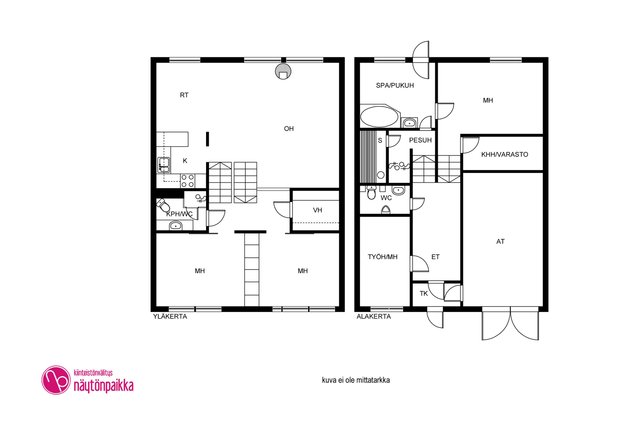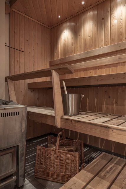 - Puulämmitteinen sauna alakerrassa. Lasitiilinen ikkuna SPA-huoneeseen. Uloskäynti takapihalle, puuterassille. Saunan lauteiden alla viemärin poistopumppu, koska sauna ja pesutilat ovat viemäritason alapuolella. Pumppu taloyhtiön vastuun piirissä.
