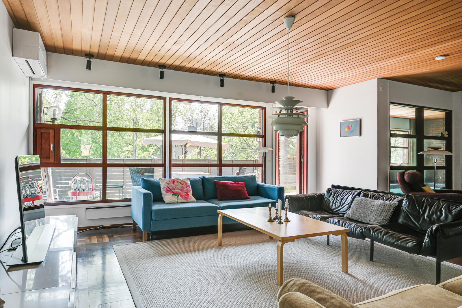 70-luvun arkkitehtuuri on parhaimmillaan tässä tyylikkäässä kodissa. Kahdessa kerroksessa on loistavasti tilaa isommallekin perheelle. Varsinaiset asuintilat sijaitsevat yläkerrassa, johon johtaa näyttävä portaikko. Olohuone/aula/ruokailutila on avaraa tilaa, johon tulvii valoa isoista ikkunoista ja aulaan myös kattoikkunasta. Tunnelmaa luo avotakka. Kaunis tumma parketti on alkuperäinen, kattopaneelit ja tiiliseinät on myös säilytetty alkuperäisessä kuosissaan.