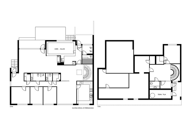 Yläkerrassa on kolme makuuhuonetta, säilytystilaa löytyy vaatehuoneista. Saunaosastolta pääsee mukavasti pihalle vilvoittelemaan. Uima-allas ei ole alkuperäisessä käytössään. Alakerrasta löytyy runsaasti moneen käyttöön mukautuvaa tilaa: ikkunalliset tilat toimivat hyvin makuuhuoneina, toimistona tai vaikka harrastetiloina. Lisäksi löytyy runsaasti varastotilaa.