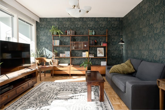 - Tilavan olohuoneen seinät tapettia, lattia parkettia, käynti lasitetulle parvekkeelle.
