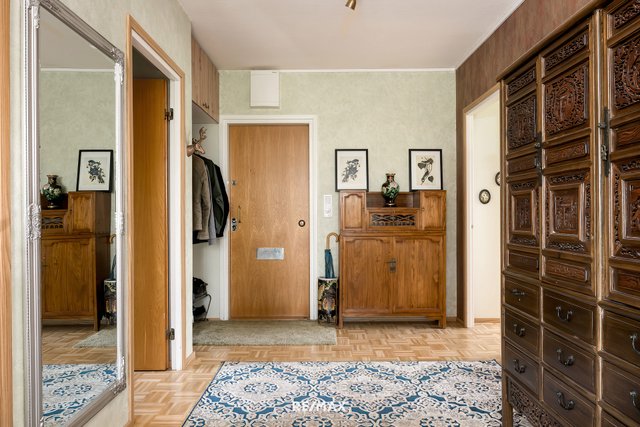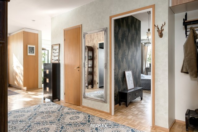 - Tilava eteinen, jonka lattia parkettia ja seinät maalattu / tapetti, vaatehuone.