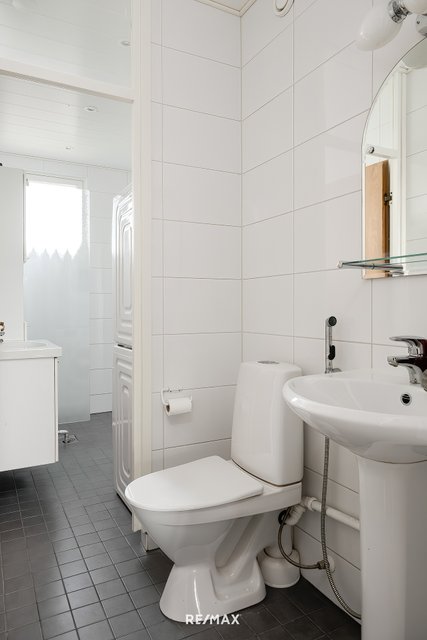 - Wc-tilan seinät ja lattiat laattaa, wc-istuin, allas, valopeili.