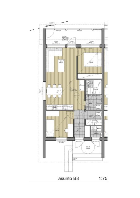 - Kodinhoitoon tarkoitetuissa pesutiloissa on liitännät ja tilavaraukset kuivaavalle pyykinpesukoneelle. Kalusteet ovat tehdasvalmisteisia Puustelli kalusteita. Komerokalusteiden ovet ovat melamiiniovia.