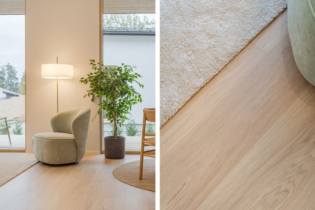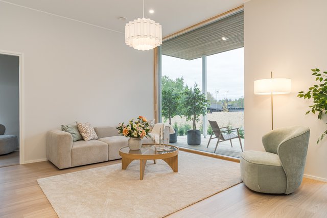 - avara ja valoisa olohuoneen ja ruokailutilan yhdistelmä