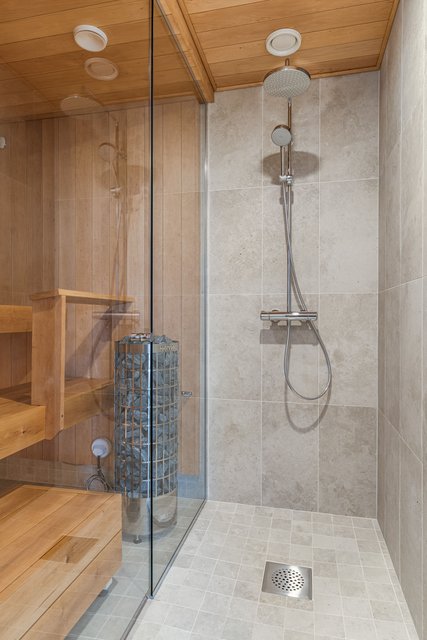 - WC-istuin, suihku, suihkuseinä, pesukoneliitäntä, lattialämmitys, peili, pesuallas, allaskaappi, ja bidee-suihku