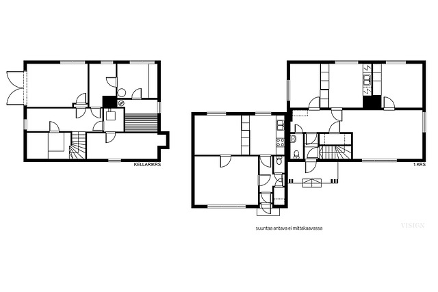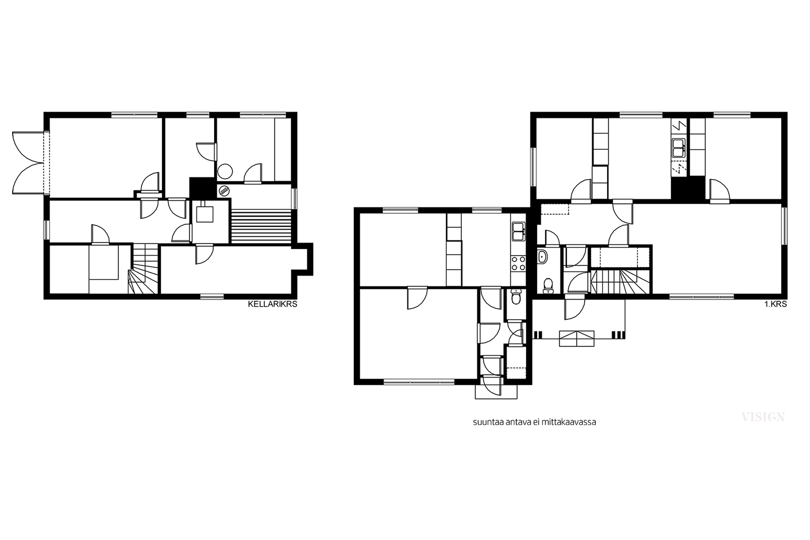 2 asuntoa : Oh, k, 2 mh, wc, s, ph, harrastehuone, laajennus: 2h, k, kph