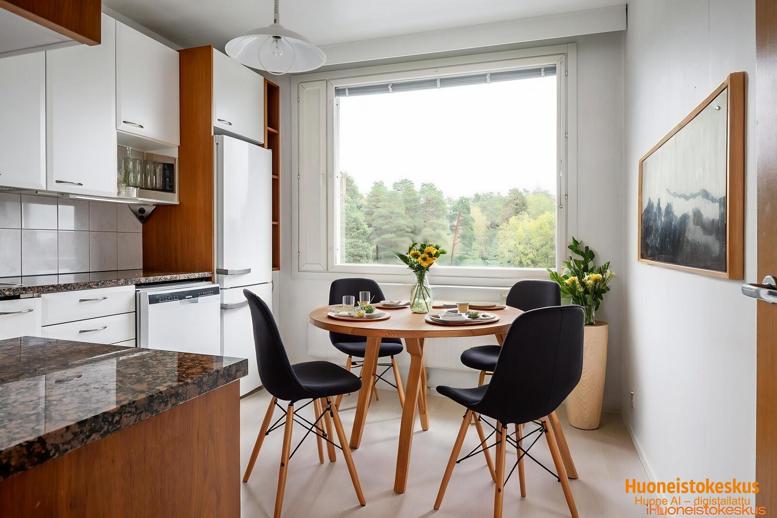 Valoisa ja toimivapohjainen kolmio hissitalon 4. kerroksessa – tilava keittiö ja lasitettu länsiparveke.