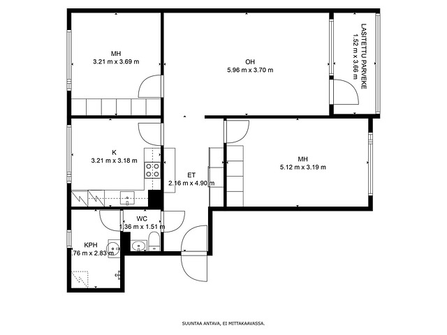 - Pinta-alaa ei ole tarkistusmitattu. Edellä mainittu pinta-ala saattaa tämän ikäisessä kohteessa poiketa olennaisestikin huoneiston nykyisten mittaustapojen ja standardien mukaan laskettavasta pinta-alasta. Huoneiston todellinen asuinpinta-ala voi siis olla esitteessä mainittua pienempi tai suurempi.