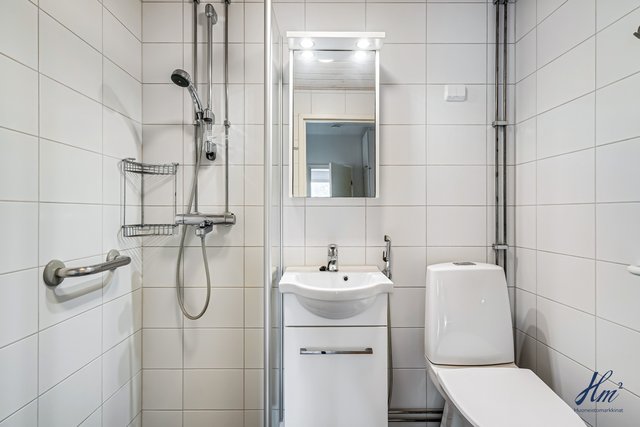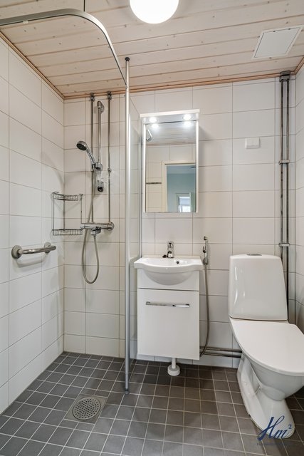 - WC-istuin, suihku, pesukoneliitäntä, peilikaappi, allaskaappi, pesuallas, bidee-suihku, ja suihkuseinä