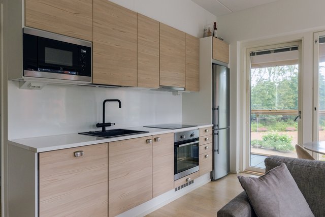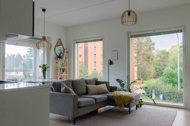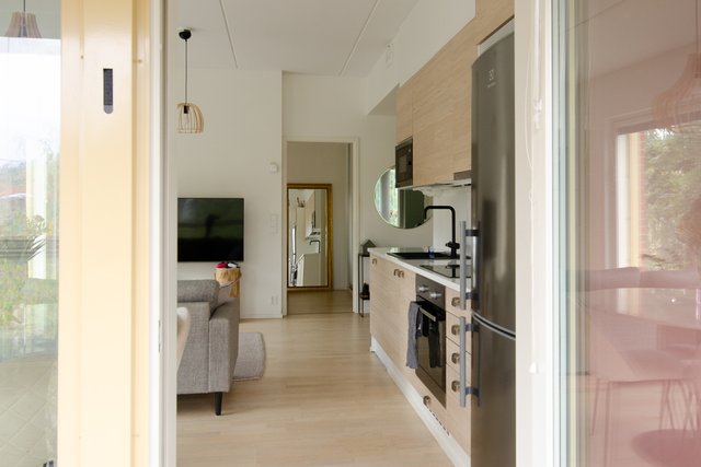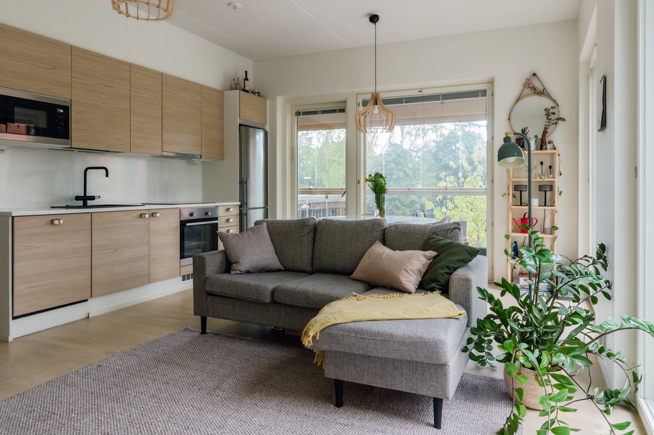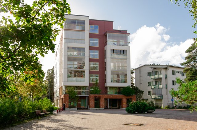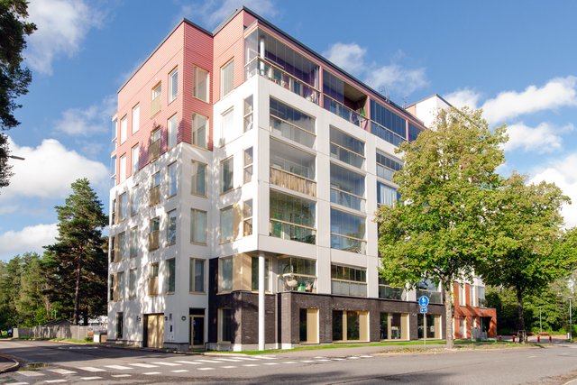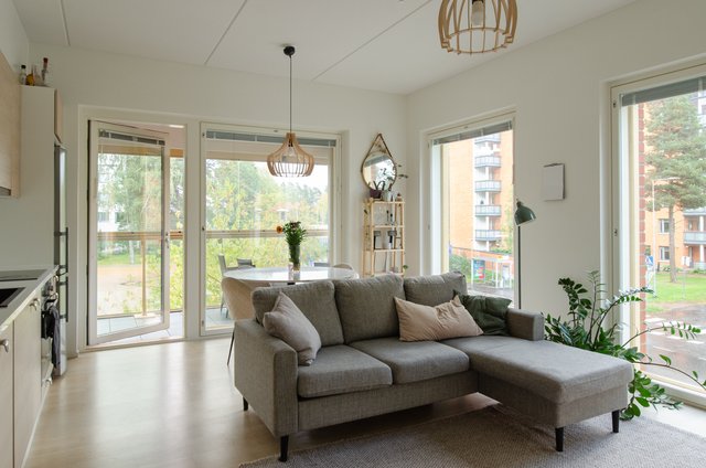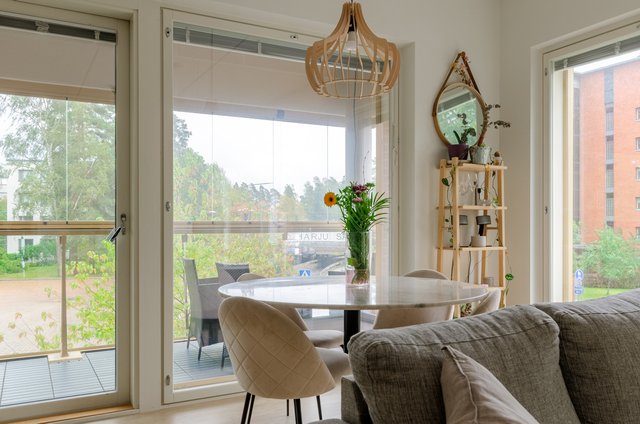 Suuret ikkunat tuovat avaruutta ja luonnonvaloa olohuoneeseen, isolla lasitetulla parvekkeella viihtyy aikaisesta keväästä myöhäiseen syksyyn. Asumismukavuutta lisää vesikiertoinen lattialämmitys. Lattiat ovat valkotammiparkettia ja keittiössä musta komposiittiallas, rosteriset kodinkoneet ja painosalpamekanismilla varustetut kaapinovet antavat viimeistellyn silauksen. Huoneistoon kuuluu tilava lämmin varasto. Kaikille yhteisiä ulkoiluvälinevarastoja on kaksi ja avara saunaosasto sijaitsee taloyhtiön ylimmässä kerroksessa. Tästä kahden makuuhuoneen asunto vaativaankin makuun!Pohjakuva