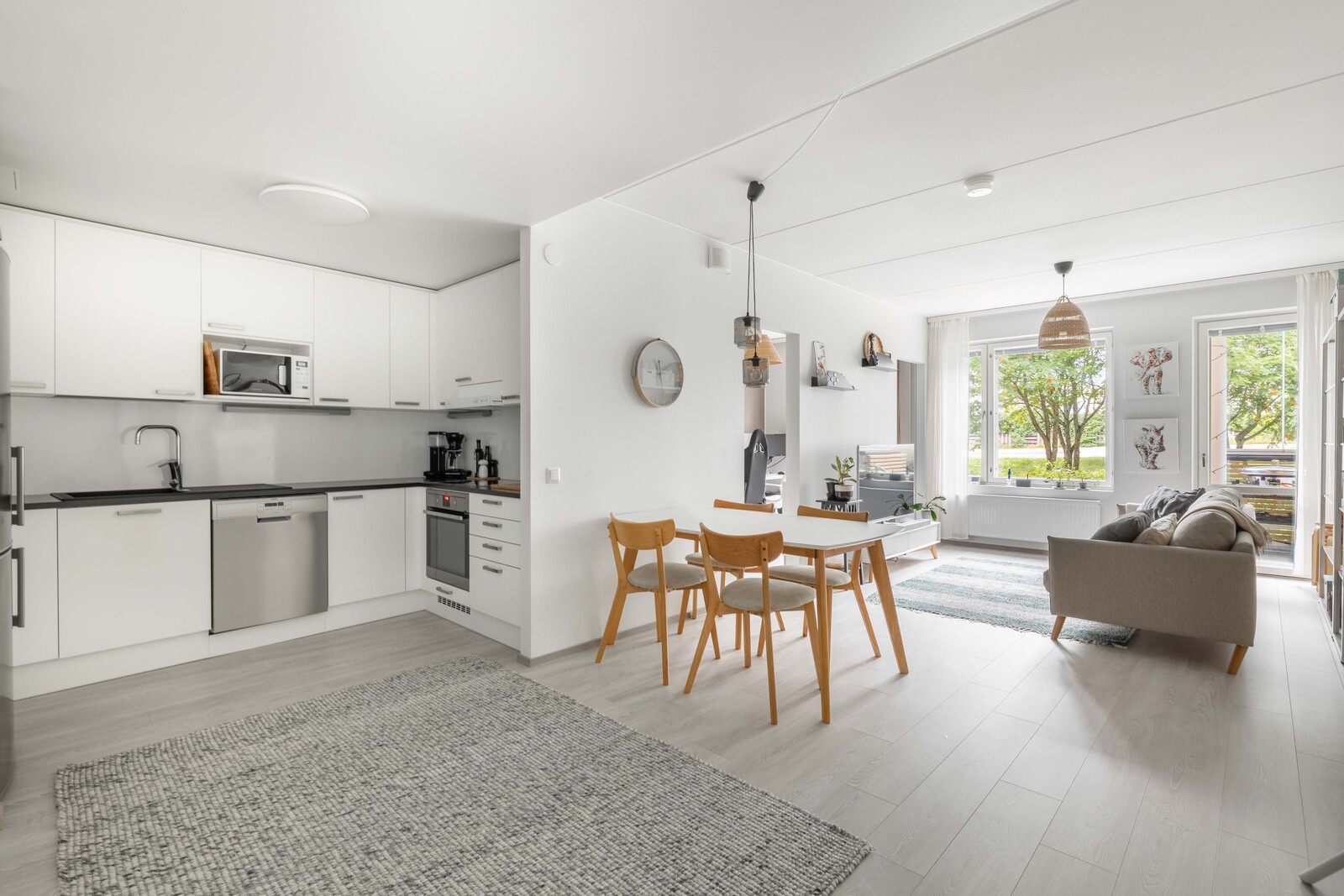 Kodin kruunaa avara ja valoisa olohuone, joka yhdistyy sulavasti keittiöön. Keittiössä on runsaasti kaappeja ja laskutilaa. Olohuoneesta avautuu käynti lasitetulle parvekkeelle sekä omalle, kauniisti kivitetylle pihalle, joka tuo asumiseen aivan erityistä viihtyisyyttä.
