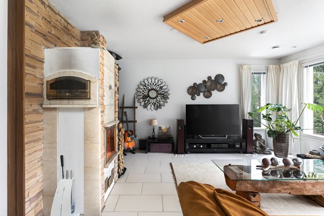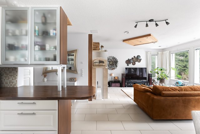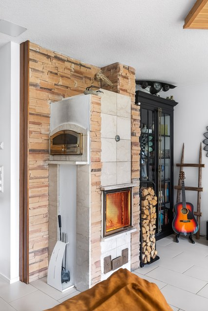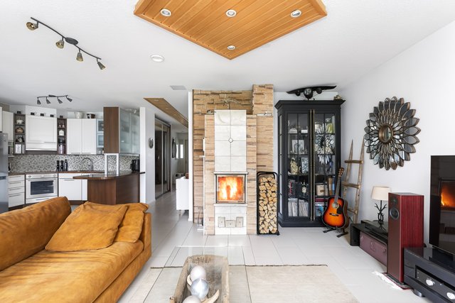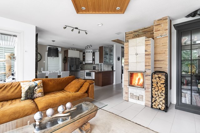 Keittiö on monipuolinen ja ruokailutila aukeaa olohuoneeseen, jossa on varaava takka lasiluukulla ja leivinuunilla. Tilasta aukeaa ihanan rauhoittava näkymä ulos länteen.