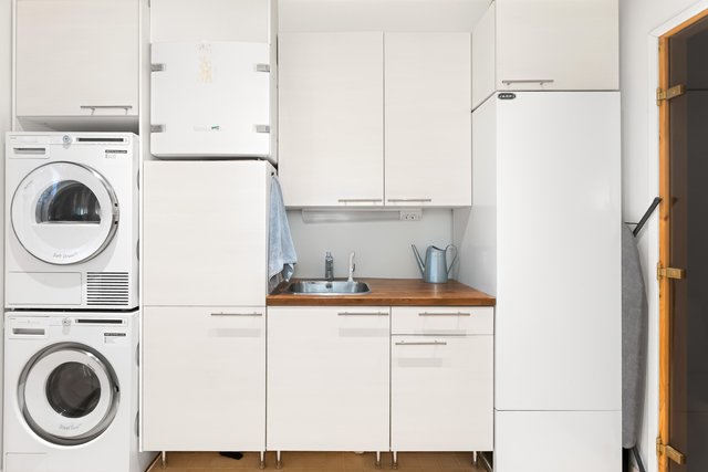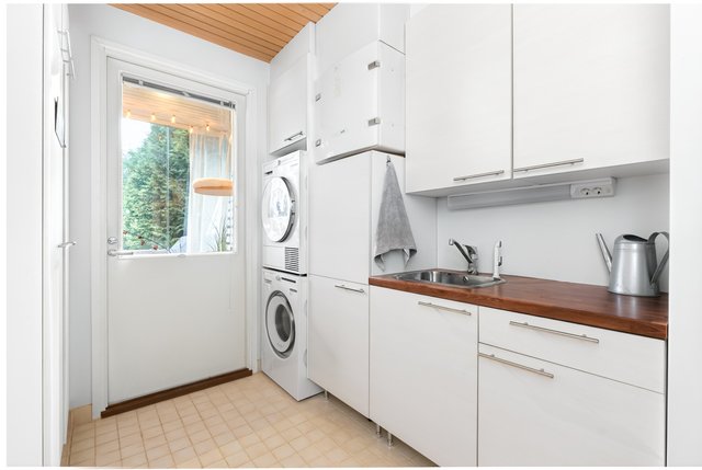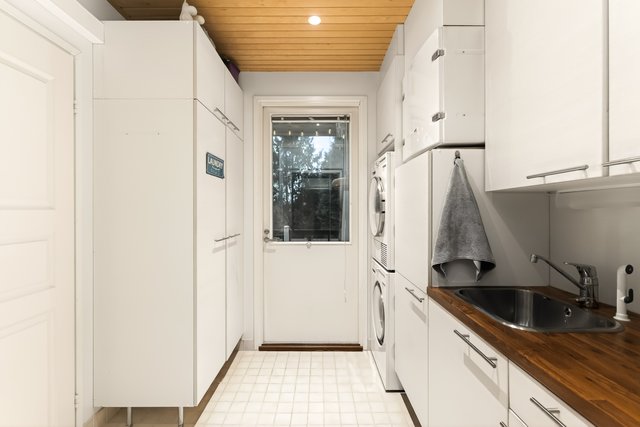 - Paikka pesutornille, pk-liitin, pyykkikaappi, pesuallas rst, tasoa, silityspöytä, p lattialämmitys, kulku ulos. Lattia laattaa, seinät maalattu.