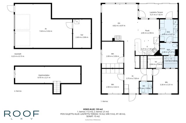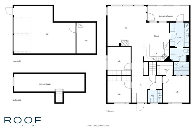 - Asuinpinta-ala n. 112 m2, käyttöullakon lattiala n. 22,5 m2, talli ja varasto n. 52,5 m2, sekä lasitettu terassi. Rakennuslupapiirustusten mukaan kellarin krs ala 122 m2 ja asunnon 123 m2. Ei tarkistusmitattu. Pinta-ala voi siis olla edellä mainittua pienempi tai suurempi. Kohteen markkinoinnissa käytetään mittatiedoilla varustettua pohjapiirrosta. Ostaja on tietoinen, että pohjakuva on suuntaa antava, ei mittakaavassa, eikä perustu virallisiin piirustuksiin. Pohjapiirroksessa näkyvät mitat on luotu automaattisesti 3D- skannauksesta (leveys x pituus), eikä niiden oikeellisuutta ole tarkistettu.
