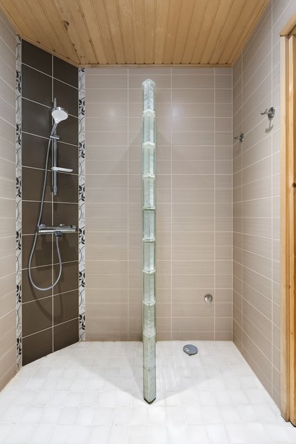 - Wc-istuin, + paikka toiselle tai istuinbideelle tai 2. suihkulle. Suihkuseinä lasitiilestä, lattialämmitys. Lattia laattaa, seinät kaakelia.