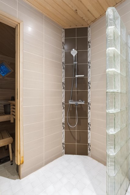 - IKI-kiuas, kiviä yli 100kg, sähkökiuas, lattia laattaa, seinät ja katto puupanelia.