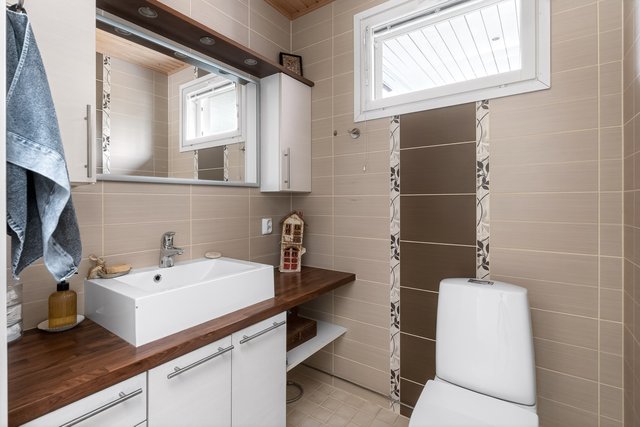 - Eteisessä: allas ja -kaappi, peilikaappi, tasotilaa, ikkuna, wc-istuin, käsibide, lattialämmitys. Lattia laattaa, seinät kaakelia.