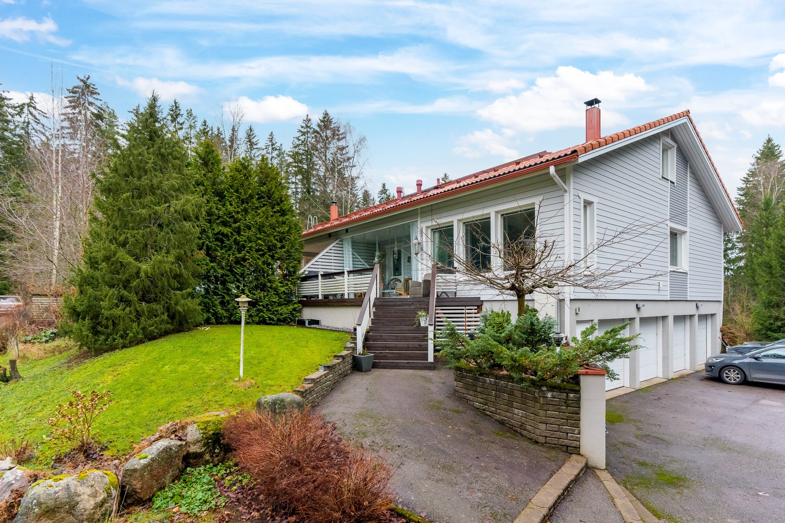 4h, k, khh, kph, s, wc, vh, käyttöullakko, lasitettu terassi, 2 auton talli ja lämmin varasto