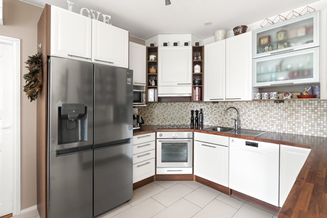 - Side by side jääkaappi pakastin, jossa jääpalakone ja vesiautomaatti. Astianpesukone, liesituuletin, keraaminen liesi, kaapistot. Tasot laminaattia, lattia laattaa, seinät maalattu ja laatoitettu tason yläpuolelta.